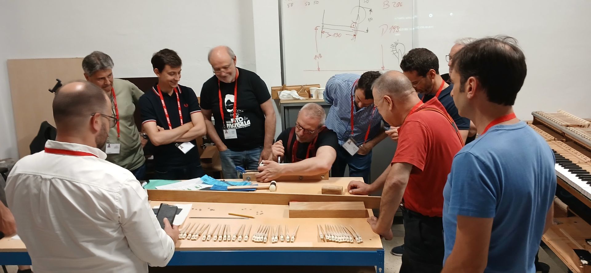 Del 7 al 10 de septiembre tuvo lugar en Humanes de Madrid el curso de montaje y regulación de las maquetas de dos octavas construidas por el técnico e inventor Xavi García, inspiradas en el modelo alemán. Este curso estuvo enfocado a la preparación del examen ETD II. A lo largo de estos cuatro días, quienes participaron del curso pudieron no sólo conocer cómo se habían construido estas maquetas de la mano de su creador, sino también participar activamente en el montaje de las mismas. Durante el curso se encordaron las maquetas y se montaron todos los elementos de la mecánica: encolado de mangos de martillos, mortesas y apagadores; montaje de básculas, nueces y lamas de apagador; se asentó, prerreguló y ajustó la mecánica y el teclado. La maqueta fue pinzada y afinada repetidas veces para estabilizarla. En este curso participaron un total de 10 personas, 6 ETDs y 4 socios aspirantes a socio profesional. El sábado día 9 tuvo lugar la tradicional cena de fraternidad. Agradecemos al ponente Xavi García por su generosidad por compartir su tiempo, conocimientos y asistencia en este curso; también dedicamos un especial agradecimiento a nuestro expresidente, Bartolomé Magán, por abrirnos las puertas de su taller, a Bilbao Trading Partnership S. L. por cedernos el espacio para poder realizar el curso, y a todas aquellas personas que han participado tanto del curso como de la organización del mismo, las cuales han contribuido a que esta propuesta saliera adelante.