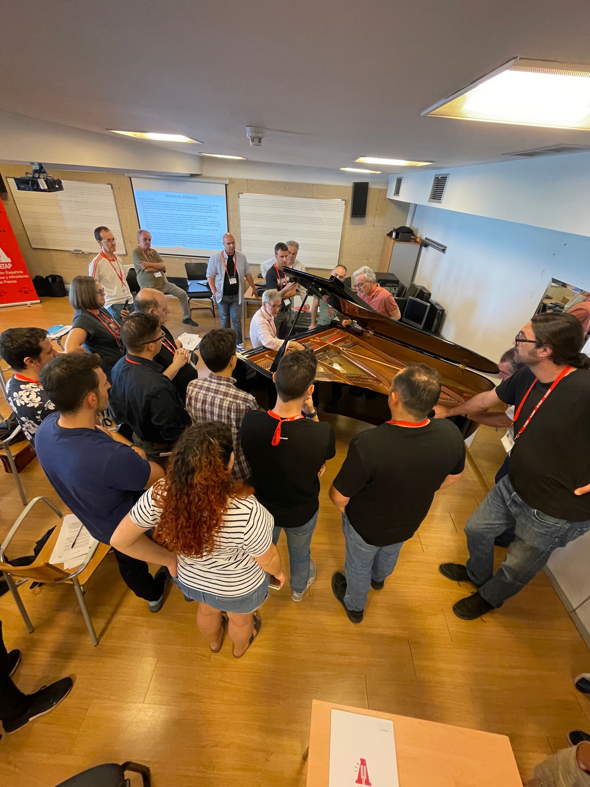 Del 16 al 18 del pasado mes de junio se celebraron las Jornadas de ASETAP en el Conservatorio Profesional de Música de Valladolid. Dentro de las jornadas se realizó un curso teórico-práctico sobre afinación aural. Sergio Brunello es un destacado técnico italiano, Klavierbauer, con muchos años de experiencia. Ha colaborado con la asociación en numerosas ocasiones, en cursos y exámenes anteriores. Dividió el proceso de afinación en varias etapas: estabilidad, unísonos, octavas, temperamento y afinación completa. Después de la introducción teórica y demostración de cada bloque, los/as asistentes subían a las cabinas a poner en práctica las recomendaciones recibidas y Sergio pasaba a revisar individualmente los trabajos prácticos. Esta parte práctica se realizó la mayor parte de tiempo por parejas, de este modo los/as participantes pudieron realizar una escucha tanto activa como pasiva, y se beneficiaron de los comentarios que Sergio brindaba no solo a sí mismos sino a los demás. El total de participantes fue de 25 personas. El sábado por la noche hubo la cena de fraternidad en la que se entregaron los diplomas ETD I a las personas que aprobaron el examen en Granada y se obsequió por primera vez con la estatuilla de ASETAP a un nuevo socio honorífico: Silvano Coello. El domingo por la mañana se celebró, también en el conservatorio, la XXXI Asamblea General Ordinaria de ASETAP. Queremos agradecer a la dirección del Conservatorio Profesional de Música de Valladolid la ocasión que nos han ofrecido para realizar estas jornadas, y a nuestro socio Xavi Pérez por su trabajo en la organización del evento. Así como a todas las personas que han colaborado en la realización de este encuentro.